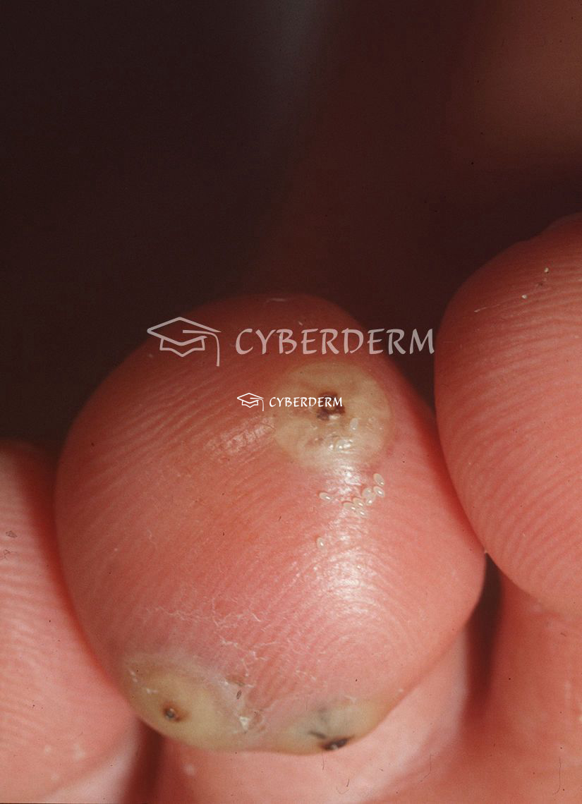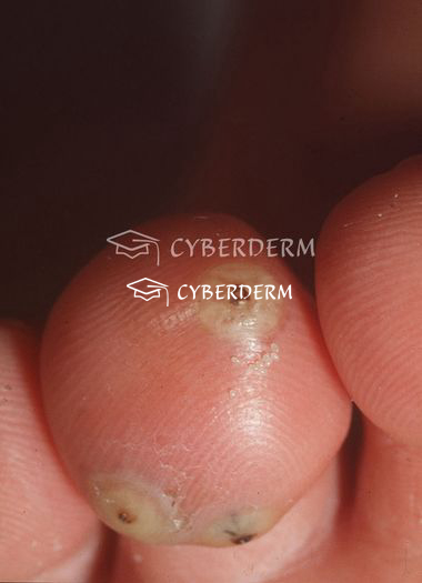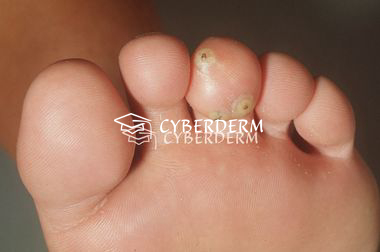 Bevorzugt, aber nicht ausschließlich an Füßen, Zehen, unter den Zehennägeln und an den Interdigitalstellen.