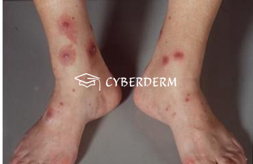 Pápulas urticarianas múltiplas, muito pruriginosas, com pontos centrais hemorrágicos. Distribuição tipicamente assimétrica linear ou agrupada. Raramente reação bolhosa.